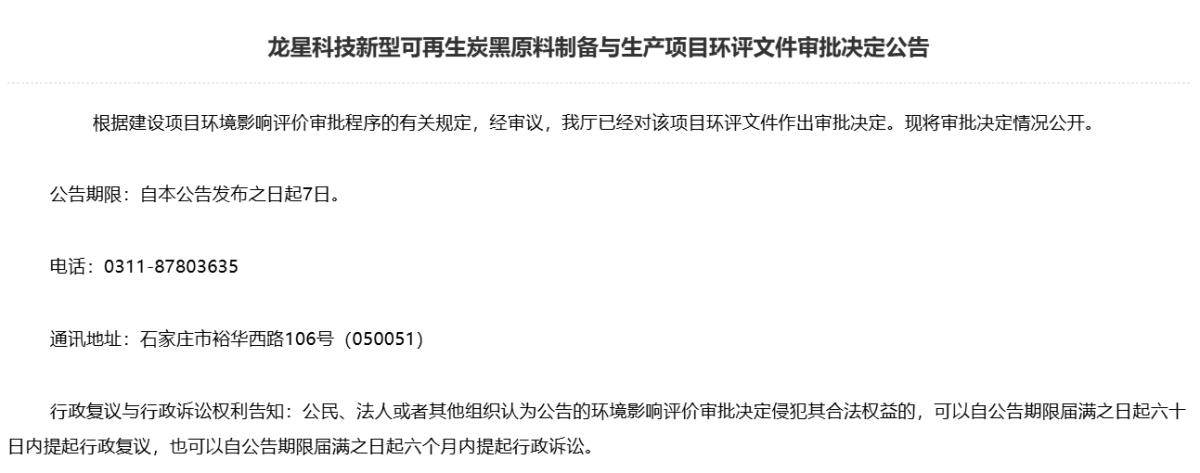 12月12日,龍星科技新型可再生炭黑原料制備與生產(chǎn)項(xiàng)目環(huán)評(píng)文件獲批復(fù)。