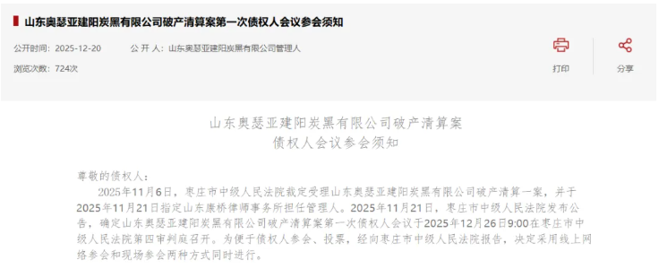 2025年11月21日,棗莊市中級人民法院發(fā)布公告,確定山東奧瑟亞建陽炭黑有限公司破產清算案第一次債權人會議于2025年12月26日9:00在棗莊市中級人民法院第四審判庭召開。