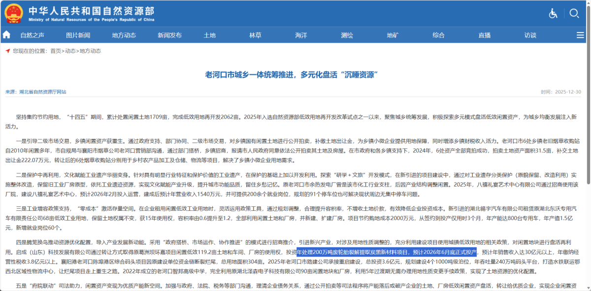 最新消息顯示,啟成(山東)科技發(fā)展有限公司年處理200萬噸廢輪胎裂解提取炭黑新材料項(xiàng)目預(yù)計(jì)于2026年6月底正式投產(chǎn)。
