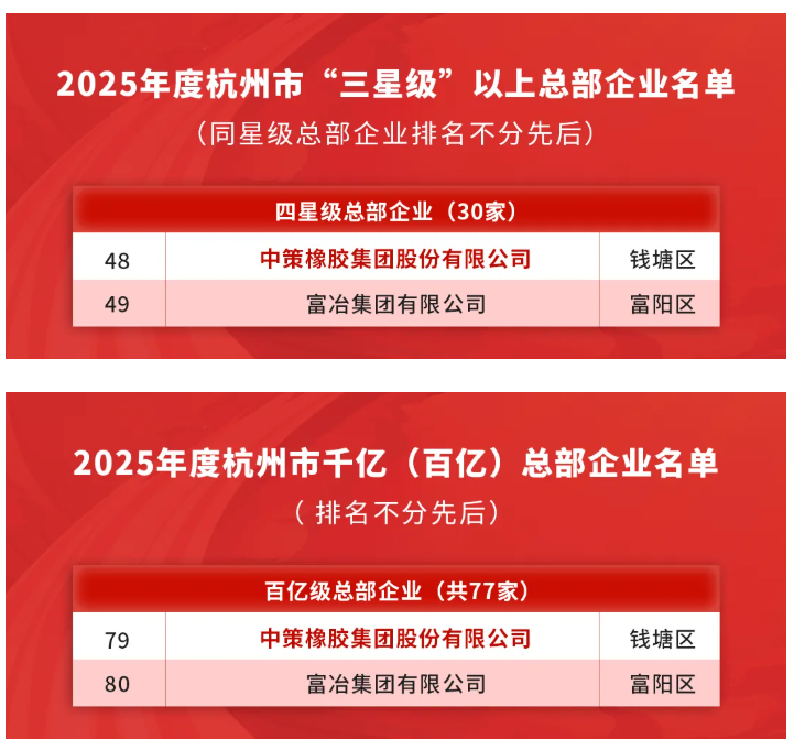 【炭黑產(chǎn)業(yè)網(wǎng)】2月2日消息,近日,杭州市2025年度星級(jí)總部企業(yè)評(píng)定結(jié)果塵埃落定。中策橡膠憑借自身強(qiáng)大的綜合實(shí)力以及穩(wěn)定且良好的發(fā)展態(tài)勢(shì),再度斬獲“杭州市四星級(jí)總部企業(yè)”稱號(hào),同時(shí)還榮獲“杭州市百億級(jí)總部企業(yè)”殊榮。這一成果不僅進(jìn)一步夯實(shí)了公司在區(qū)域經(jīng)濟(jì)發(fā)展中的關(guān)鍵支撐地位,更是對(duì)其在規(guī)模貢獻(xiàn)、創(chuàng)新能力以及成長(zhǎng)潛力等多方面的高度肯定。