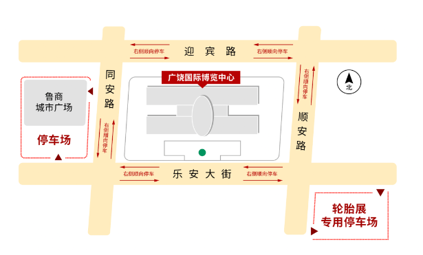 第十四屆廣饒輪胎展共設(shè)置了兩個(gè)專用免費(fèi)停車場分別是輪胎展專用停車場位于樂安大街和順安路交叉口東南角(圖上紅色區(qū)域)和魯商城市廣場停車場位于展館西側(cè)(圖上紅色區(qū)域)。