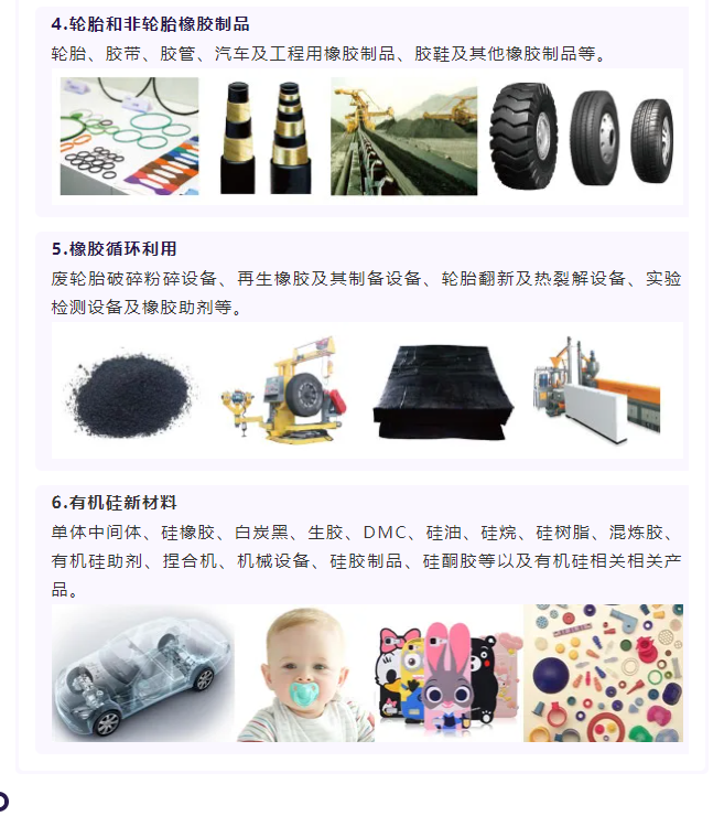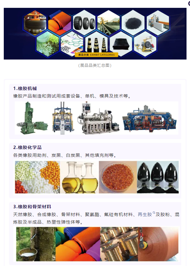 大灣區(qū)橡膠展展品包含橡膠機械(橡膠產(chǎn)品制造和測試用成套設(shè)備、單機、模具及技術(shù)等)、橡膠化學(xué)品(各類橡膠用助劑、炭黑、白炭黑、其他填充劑等)、橡膠和骨架材料(天然橡膠、合成橡膠、骨架材料、聚氨酯、氟硅有機材料、再生膠及膠粉、混煉膠及半成品、熱塑性彈性體等)、輪胎和非輪胎橡膠制品(輪胎、新能源汽車及工程用橡膠制品、空調(diào)及家電類橡膠制品、制鞋類、橡膠管帶類、其他氟橡膠和硅膠橡膠制品等)、橡膠循環(huán)利用(廢輪胎破碎粉碎設(shè)備、再生橡膠及其制備設(shè)備、輪胎翻新及熱裂解設(shè)備、實驗檢測設(shè)備及橡膠助劑等)等。
