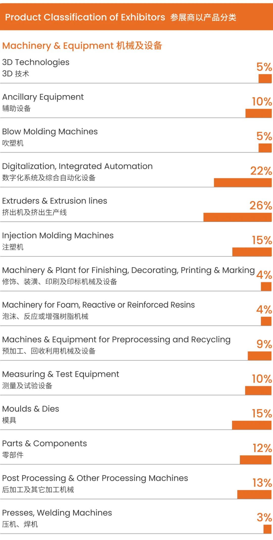 機械及設備:注塑機(36%)擠出機及擠出生產(chǎn)線(32%)模具(30%)