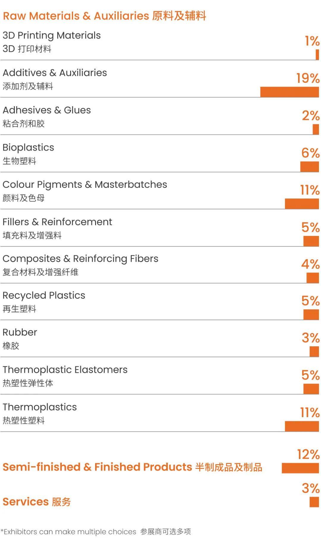 原料及輔料:顏色及色母(32%)添加劑(30%)熱塑性塑料(29%)