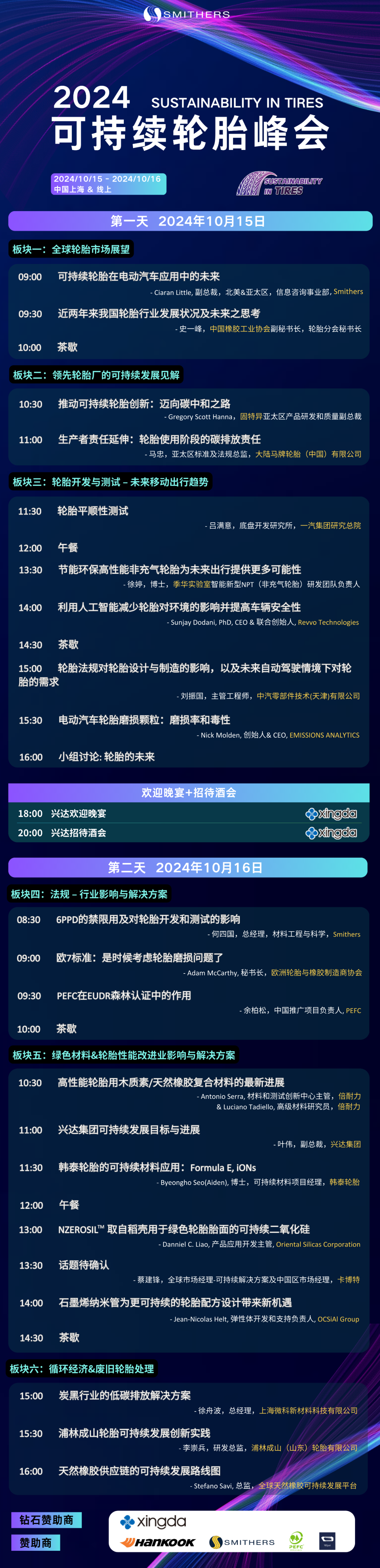 2024可持續(xù)輪胎峰會將于10月14 - 16日在上海舉行!會議支持線上和線下兩種參會模式,并提供中英文同聲傳譯服務(wù)。