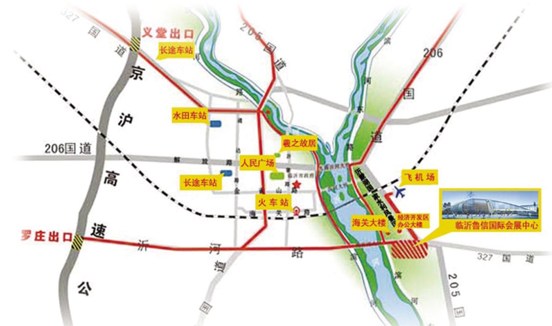 ?臨沂機場—臨沂國際會展中心出租車:①全程約5.3公里,全程約15分鐘。公交車:①K33路 ( 飛機場路口站 →臨沂國際會展中心站 )用時:約40分鐘