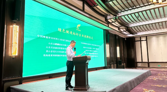 理事會/常務理事會(擴大會議)期間舉行了綠色制造標桿企業(yè)和綠色制造先進企業(yè)授牌儀式,協(xié)會輪值會長、煙臺石川密封科技股份有限公司副總經(jīng)理王平宣讀了協(xié)會《關(guān)于授予中國摩擦密封材料行業(yè)綠色制造標桿企業(yè)與綠色制造先進企業(yè)稱號的決定》。經(jīng)會員單位自愿申報、協(xié)會綠色低碳工作小組進行審定、協(xié)會官方媒體公示、公告,經(jīng)研究決定授予山東金麒麟股份有限公司、山東圣泉新材料股份有限公司、黃山菲英汽車零部件有限公司、珠海格萊利摩擦材料股份有限公司“中國摩擦密封材料行業(yè)綠色制造標桿企業(yè)”稱號,授予博世汽車技術(shù)服務(中國)有限公司、河北星月制動元件有限公司、浙江科馬摩擦材料股份有限公司、山東萊蕪潤達新材料有限公司“中國摩擦密封材料行業(yè)綠色制造先進企業(yè)”稱號。