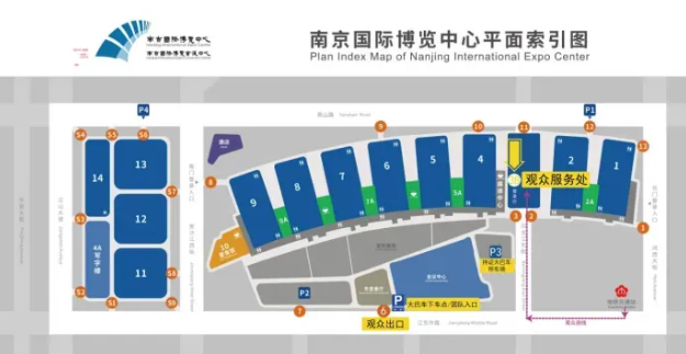 導航至南京國際博覽中心7號門-P2停車場,步行至東門登錄大廳入口。