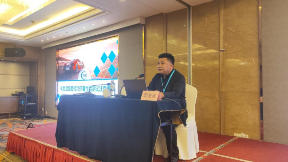 國家橡膠輪胎質(zhì)量檢驗檢測中心副總經(jīng)理周奎武講述《汽車輪胎濕路面相對抓著性能檢測注意事項》,從新國標(biāo)出發(fā),介紹了輪胎室外檢測相關(guān)試驗內(nèi)容,強(qiáng)調(diào)測試應(yīng)注意的有關(guān)事項。