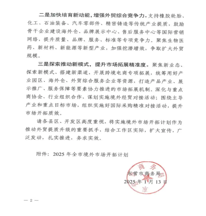 近期,東營市商務(wù)局發(fā)布了關(guān)于2025年度境外市場開拓計(jì)劃的通知,通知中顯示,2025年度境外市場開拓計(jì)劃擬安排160個(gè)展會(huì)項(xiàng)目,其中重點(diǎn)組織類展會(huì)35個(gè)、重點(diǎn)推薦類展會(huì)125個(gè)。其中,阿聯(lián)酋中國輪胎汽配展成功入選東營市2025年度境外市場開拓重點(diǎn)組織類展會(huì)。
