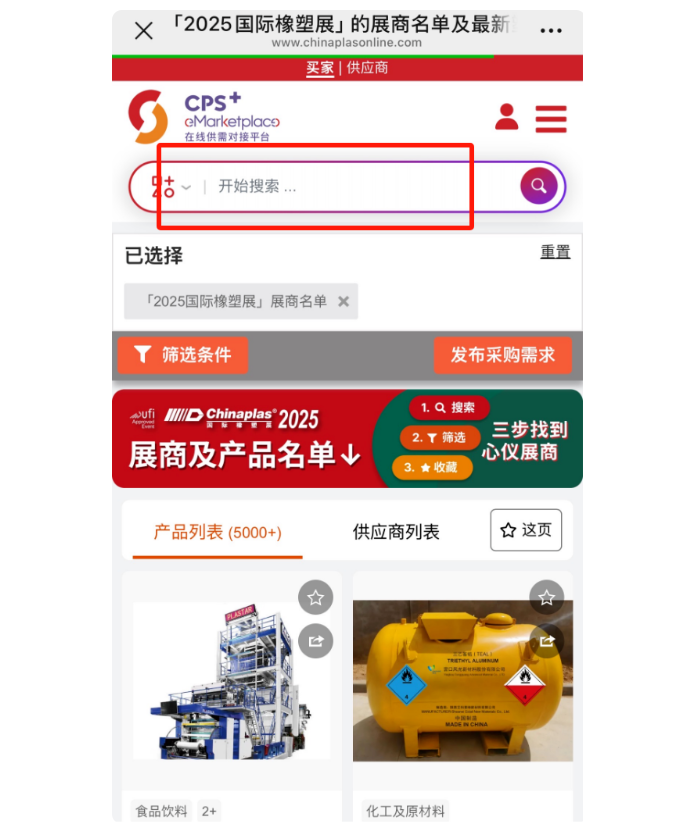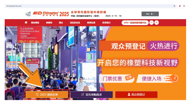 在瀏覽器中輸入www.chinaplasonline.com,打開(kāi)CHINAPLAS官網(wǎng)首頁(yè),點(diǎn)擊“2025展商名單”即可快速查閱。
