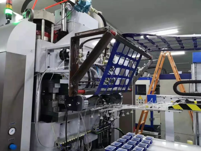 HSC-720型多功能高速吸塑機(jī)是集機(jī)、電、氣一體化設(shè)計(jì),采用微電腦可編程控制器(PLC)控制,人機(jī)界面操作,鏈條式傳動(dòng)送片,隧道式分段漫輻射加熱,凸輪式驅(qū)動(dòng)上下模成型,模內(nèi)激光刀剪,即送片、加熱、拉伸、成型、切邊、堆垛一次性完成的全自動(dòng)高效塑料片材成型設(shè)備。