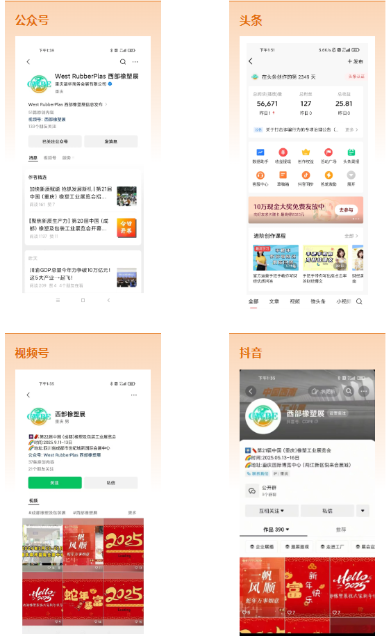 二十屆橡塑展,西部橡塑展每一屆展會(huì)都會(huì)搭建包括官方網(wǎng)站、公眾號(hào)、視頻號(hào)、抖音號(hào)等在內(nèi)完整自營(yíng)媒體矩陣,自營(yíng)媒體不僅可以實(shí)時(shí)精準(zhǔn)的發(fā)布展會(huì)的最新動(dòng)態(tài),更能掌握展商客商的真實(shí)反饋,提升服務(wù)效率和品質(zhì)。