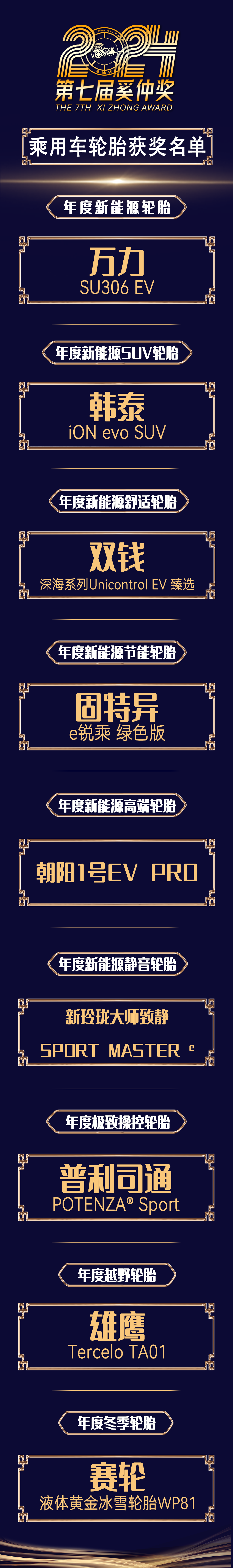 下面公布的是第七屆奚仲獎乘用車輪胎獲獎單元 (新能源乘用車輪胎和燃油乘用車輪胎),恭喜: