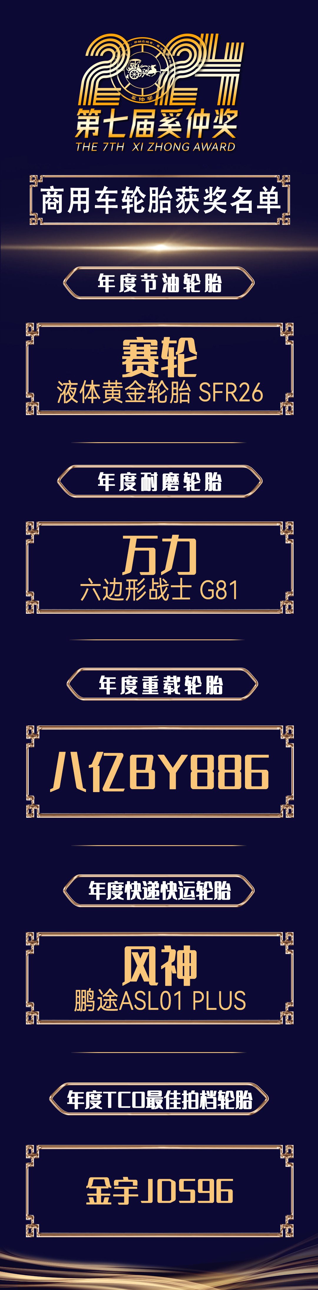 第七屆奚仲獎獎項包括“新能源乘用車輪胎、燃油乘用車輪胎、 商用車輪胎”、 品牌/技術單元 ,角逐出本屆奚仲獎的20項王冠。