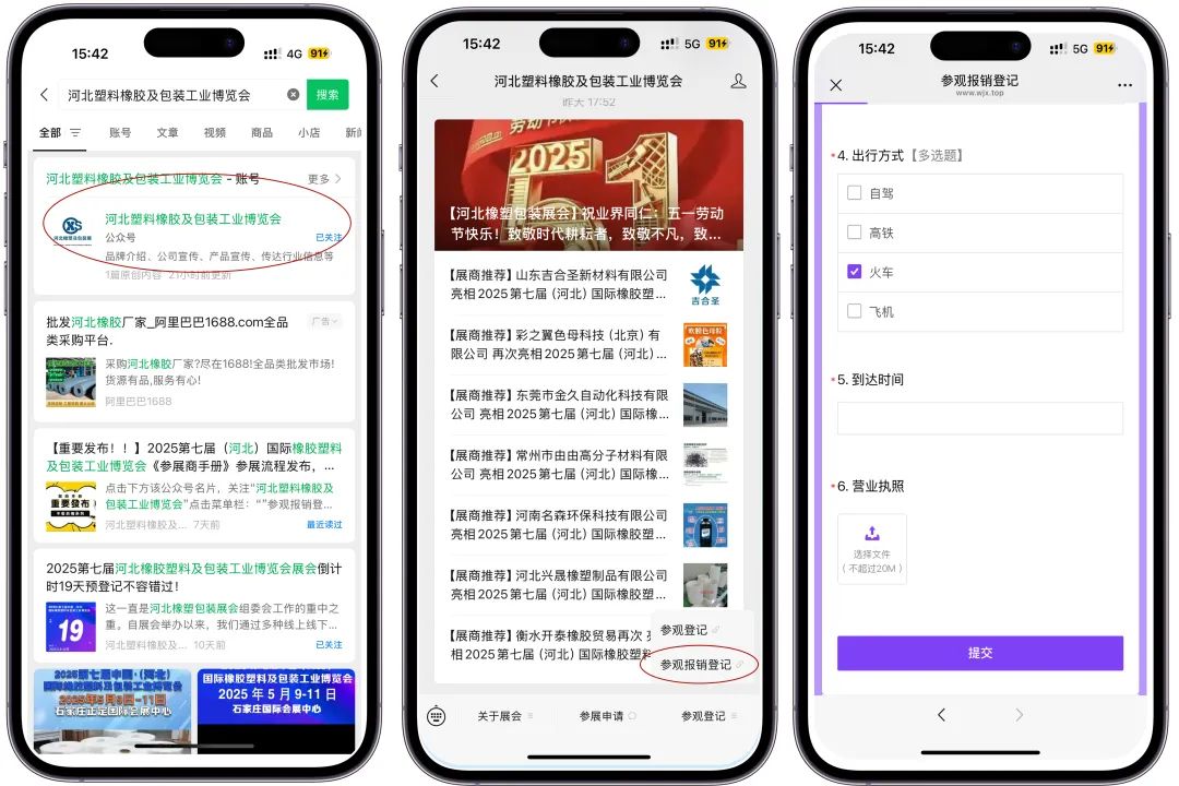 (1)報(bào)銷需于5月8日23:59分前在公眾號(hào)(河北塑料橡膠及包裝工業(yè)博覽會(huì))預(yù)約報(bào)銷登記,報(bào)銷資料提交時(shí)間僅限(5月9日至11日11:00到下午17:00)在石家莊國際會(huì)展中心(正定), 本人現(xiàn)場(chǎng)簽到,并提交(紙質(zhì)版車票),展會(huì)結(jié)束30個(gè)工作日內(nèi)報(bào)銷,不預(yù)約不現(xiàn)場(chǎng)簽到不報(bào)銷,過時(shí)不候。