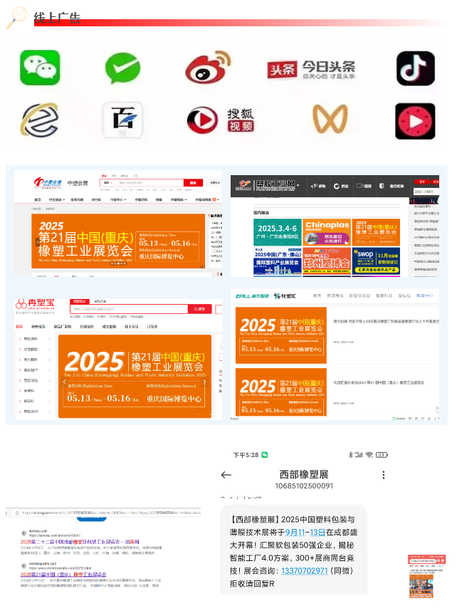 與橡塑市場(chǎng)商/學(xué)/協(xié)會(huì)對(duì)接,組織參觀團(tuán)到會(huì)。組委會(huì)經(jīng)過(guò)20余屆辦展歷程,已與渝、川、云、貴、陜等西部幾十余家行業(yè)商/學(xué)/協(xié)會(huì)、媒體單位、知名用戶企業(yè)達(dá)成戰(zhàn)略合作伙伴關(guān)系。屆時(shí),將共同組織邀約商家和協(xié)會(huì)會(huì)員單位參觀展會(huì)。