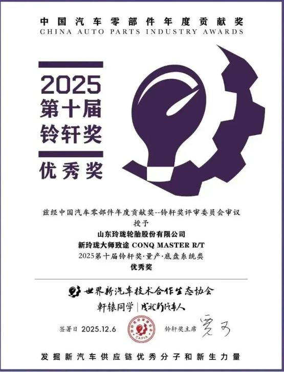【炭黑產(chǎn)業(yè)網(wǎng)】12 月 11 日消息,12 月 6 日,第十屆鈴軒獎(jiǎng)?lì)C獎(jiǎng)典禮于蘇州圓滿落幕。在這場(chǎng)歷經(jīng)半年籌備、由 29 位行業(yè)專家嚴(yán)苛評(píng)審的評(píng)選中,玲瓏輪胎從超百項(xiàng)參評(píng)技術(shù)里脫穎而出,一舉將兩項(xiàng)大獎(jiǎng)收入囊中,其 “廢舊輪胎制備液體再生膠可循環(huán)輪胎應(yīng)用技術(shù)” 拿下前瞻類優(yōu)秀獎(jiǎng),“新玲瓏大師致途” 輪胎則斬獲量產(chǎn)類優(yōu)秀獎(jiǎng)。這已是玲瓏輪胎第六次斬獲這一汽車零部件領(lǐng)域權(quán)威獎(jiǎng)項(xiàng),同時(shí)該企業(yè)也成為本年度唯一獲獎(jiǎng)的輪胎企業(yè),盡顯其在行業(yè)內(nèi)長(zhǎng)期領(lǐng)先的創(chuàng)新硬實(shí)力。