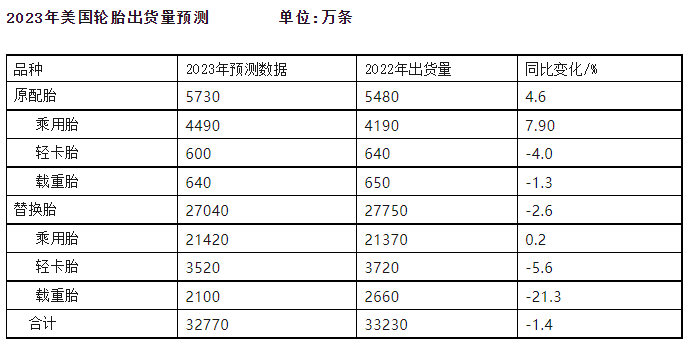 【炭黑產(chǎn)業(yè)網(wǎng)】12月7日消息,根據(jù)美國輪胎制造商協(xié)會(huì)(USTMA)的最新預(yù)測,2023年美國輪胎市場呈現(xiàn)出一些變化??傮w而言,預(yù)計(jì)美國輪胎總出貨量將稍有下降,達(dá)到3.277億條,略低于2022年的3.32億條水平。