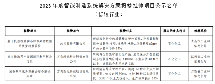 【炭黑產(chǎn)業(yè)網(wǎng)】1月9日消息,工業(yè)和信息化部近日公示了2023年度智能制造系統(tǒng)解決方案揭榜掛帥項(xiàng)目的名單,橡膠行業(yè)中有兩家企業(yè)的三個(gè)項(xiàng)目脫穎而出,成功入選。