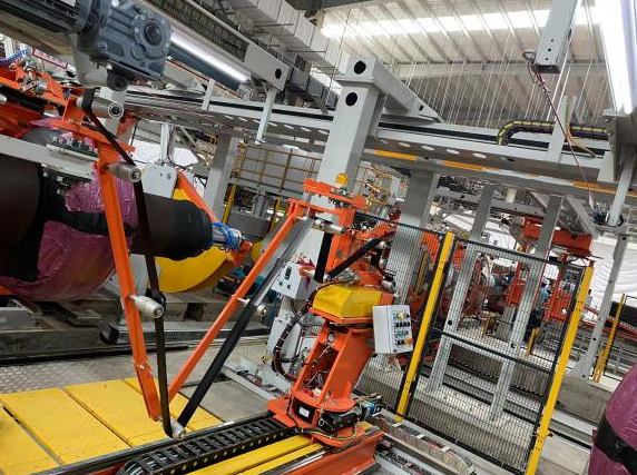 據(jù)了解,1320半鋼子午胎兩段一次法成型機于2022年3月開始研發(fā),2023年2月成功下線。本機型采用一體設(shè)計,占地面積為15m*15.5m,整機操作人員定員1人,生產(chǎn)效率單胎循環(huán)時間38-40 s,目前單班產(chǎn)量最高達(dá)到738條,日產(chǎn)突破1410條;成型過程無人干預(yù)。一段鼓采用大徑平鼓全自動貼合,胎側(cè)也采用平鼓自動貼合且自動接頭,實現(xiàn)一段生產(chǎn)過程中無人干預(yù)。新機型打破了傳統(tǒng)的二次法機型分為一段、二段兩臺獨立的設(shè)備布局,將一段、二段融合為一體;實現(xiàn)胎胚筒一段至二段自動傳遞、二段全自動運行。此外還具備機外上鋼圈、各種膠料(包括胎側(cè))全自動貼合、整個過程中設(shè)備運行區(qū)域無人化生產(chǎn)等特點。