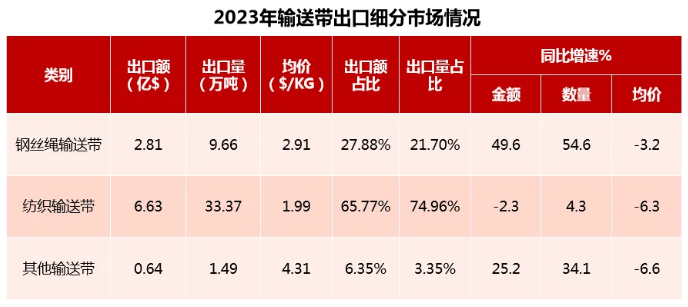 從2023年我國輸送帶產(chǎn)品細(xì)分市場來看,如下表數(shù)據(jù)所示,各類型輸送帶的出口基本保持良好增長。其中,第一大出口類型是紡織輸送帶,占輸送帶出口總額的大約2/3,出口量占比大約3/4,但紡織輸送帶是幾類輸送帶出口產(chǎn)品中均價最低的種類;鋼絲繩輸送帶出口增長幅度最大,不論是出口額還是出口量增速均在50%左右,因此在輸送帶產(chǎn)品細(xì)分市場中的比重有所提升,出口額從2022年的20%左右提升至2023年的近28%,出口量從2022年的16%提升到2023年的20%以上,成為2023整個輸送帶產(chǎn)品出口最大的增長點(diǎn);其他輸送帶類占比最少,但均價最高。