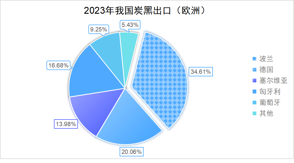 據(jù)最新數(shù)據(jù)表明,2023年我國炭黑出口的主要目的地集中在亞洲地區(qū),占總出口量的75%~78%。而在歐洲市場,出口則主要流向波蘭、德國和匈牙利,其中尤以波蘭和德國最為顯著,兩國合計(jì)占據(jù)了出口總量的54%,波蘭一國便占據(jù)了34.6%的比重。