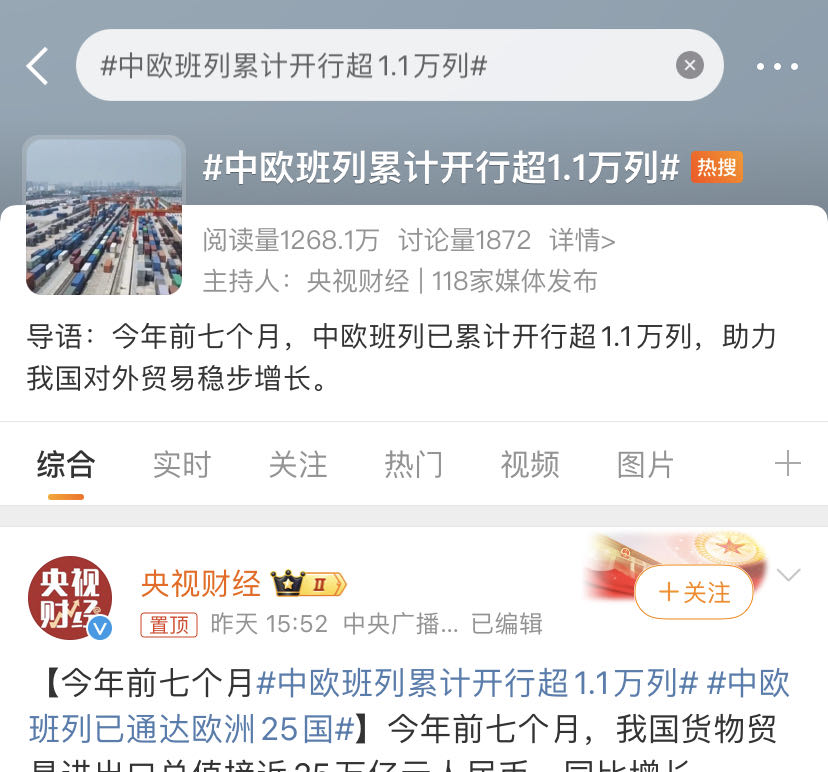 【炭黑產(chǎn)業(yè)網(wǎng)】8月13日消息,#中歐班列累計開行超1.1萬列# #中歐班列已通達歐洲25國#登上熱搜!!