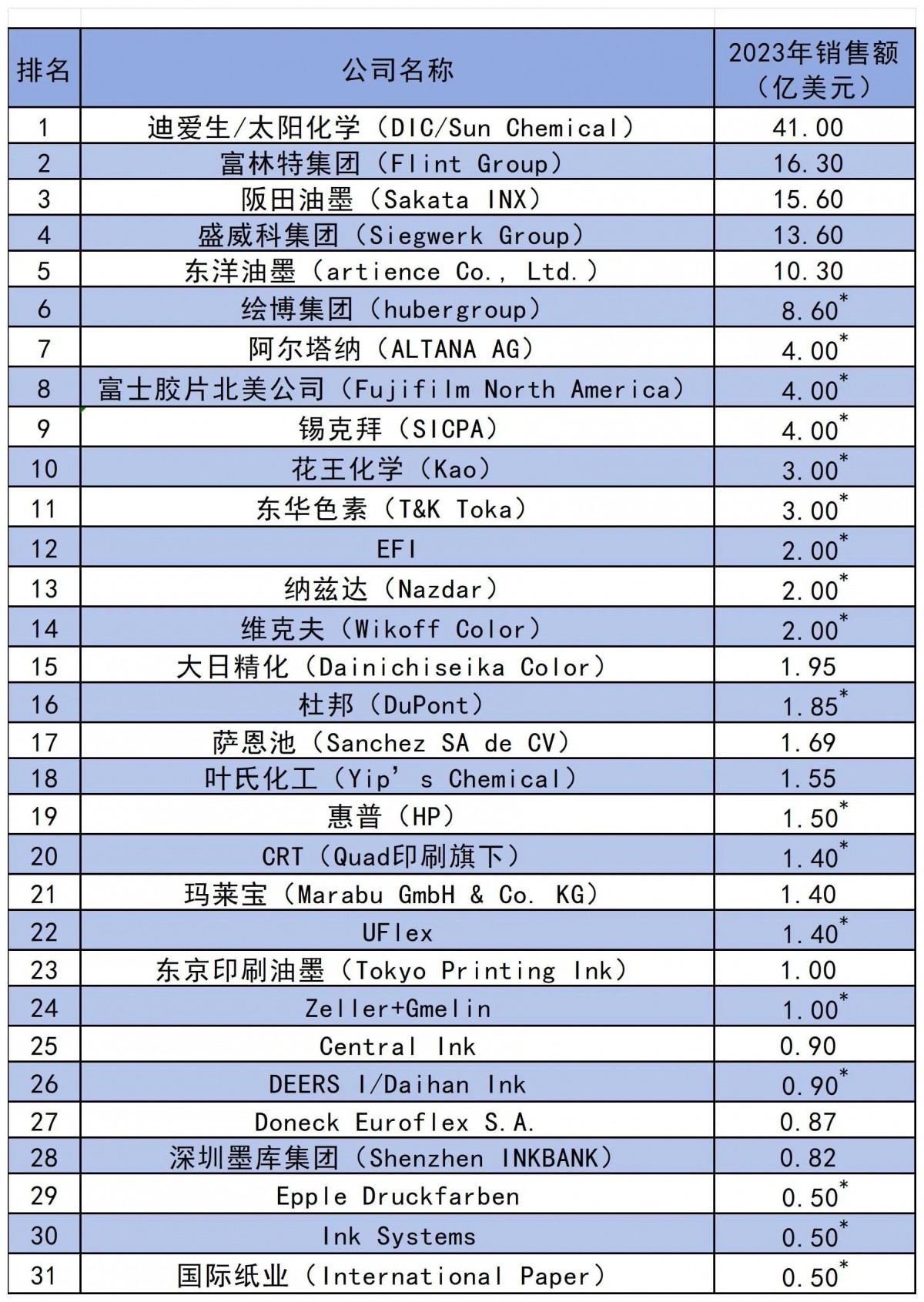 【炭黑產(chǎn)業(yè)網(wǎng)】8月30日消息,近日,《油墨世界》雜志依據(jù)最新發(fā)布的2023年度油墨銷售額數(shù)據(jù),隆重揭曉了2024年全球油墨企業(yè)排行榜,榜單中共計31家企業(yè)榮耀上榜,其中前十強企業(yè)的油墨銷售額總和占據(jù)了整個榜單總銷售額的80.73%,彰顯了行業(yè)內(nèi)的強者恒強態(tài)勢。