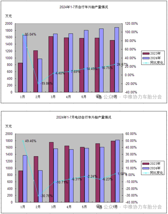根據(jù)力車(chē)胎分會(huì)對(duì)24家會(huì)員企業(yè)統(tǒng)計(jì)的數(shù)據(jù),2024年1-7月完成工業(yè)總產(chǎn)值118.47億元,同比增長(zhǎng)9.54%;實(shí)現(xiàn)銷(xiāo)售收入114.87億元,同比增長(zhǎng)8.66%。主導(dǎo)產(chǎn)品中自行車(chē)外胎產(chǎn)量11473.2萬(wàn)條,同比增長(zhǎng)16.28%;電動(dòng)自行車(chē)胎產(chǎn)量10641.3萬(wàn)條,同比下降0.59%;摩托車(chē)外胎7587.2萬(wàn)條,同比增長(zhǎng)15.03%。