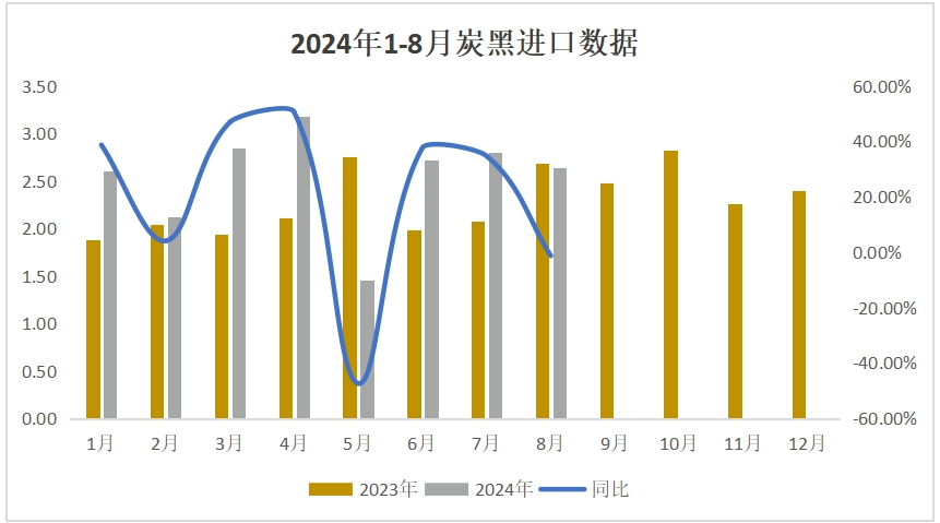 根據(jù)海關(guān)數(shù)據(jù)顯示,2024年8月中國(guó)進(jìn)口炭黑2.64萬(wàn)噸,同比減少1.34%,環(huán)比減少5.61%;2024年1-8月中國(guó)炭黑累計(jì)進(jìn)口20.36萬(wàn)噸,較去年同期增加16.65%。