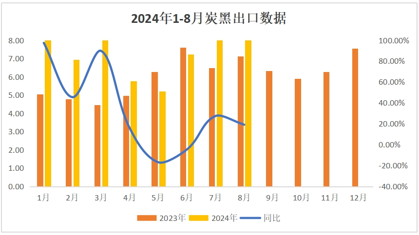 根據(jù)海關(guān)數(shù)據(jù)顯示,2024年8月中國(guó)炭黑出口約8.49萬(wàn)噸,同比增加19.05%,環(huán)比上月增加2.86%。2024年1-8月中國(guó)炭黑累計(jì)出口60.27萬(wàn)噸,較去年同期增加29.06%。