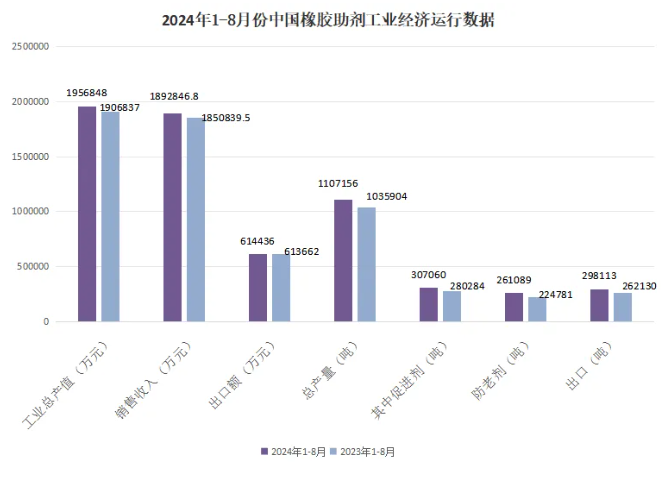 2024年1-8月份工業(yè)總產(chǎn)值195.68億元,同比增長2.62%;銷售收入189.28億元,同比增長2.27%;出口額61.4億元,同比增長0.13%;總產(chǎn)量110.07萬噸,同比增長6.88%;出口量29.81萬噸,同比增長13.73%;其中橡膠促進(jìn)劑30.7萬噸,同比增長9.55%;橡膠防老劑26.1萬噸,同比增長16.15%。