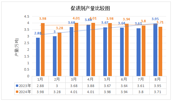 2024年前8個月促進劑產量30.7萬噸,同比增長9.6%,快速增長。