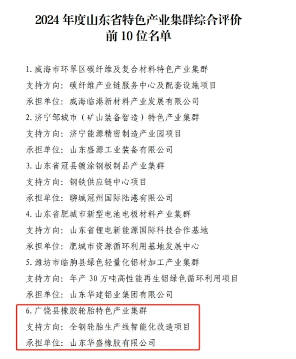 【炭黑產(chǎn)業(yè)網(wǎng)】11月28日消息,近日,山東省工業(yè)和信息化廳正式公布了2024年度山東省特色產(chǎn)業(yè)集群的綜合評(píng)價(jià)結(jié)果,其中,廣饒縣橡膠輪胎特色產(chǎn)業(yè)集群脫穎而出,成功入選綜合評(píng)價(jià)前十名榜單。這一榮譽(yù)不僅是東營(yíng)市唯一入選的產(chǎn)業(yè)集群,也標(biāo)志著廣饒縣首次在此類評(píng)價(jià)中獲得如此佳績(jī)。