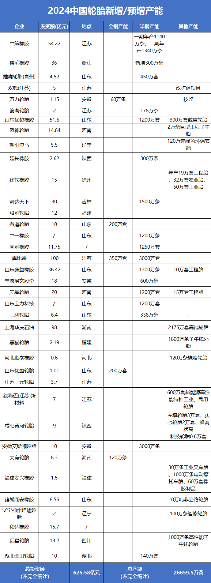 2024年,中國輪胎的擴張之路遠(yuǎn)沒有結(jié)束,頭部企業(yè)加快布局。據(jù)車轅車轍不完全統(tǒng)計,今年國內(nèi)有近40個新建/擴建輪胎項目,總投資額超600億,新增產(chǎn)能超2.5億條。中國輪胎展現(xiàn)一派欣欣向榮、生機勃發(fā)的景象!
