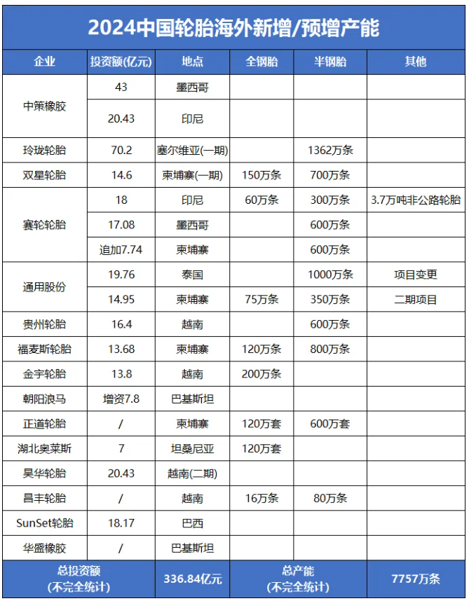 據(jù)車轅車轍不完全統(tǒng)計,2024年有15家企業(yè)出海建廠/擴產(chǎn),總投資金額超300億元,新增輪胎產(chǎn)能約8000萬條。