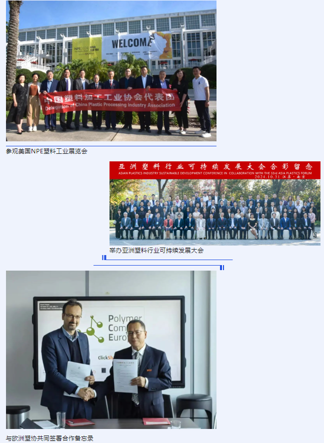 為深入了解國(guó)際政治、經(jīng)濟(jì)、行業(yè)發(fā)展、市場(chǎng)變化、循環(huán)經(jīng)濟(jì)等相關(guān)情況,對(duì)國(guó)內(nèi)企業(yè)提出參與國(guó)際化建議。2024年,中國(guó)塑料加工工業(yè)協(xié)會(huì)分赴美國(guó)、墨西哥、澳大利亞以及歐洲多國(guó)進(jìn)行交流訪問(wèn),參加國(guó)際展會(huì)及活動(dòng),與相關(guān)國(guó)家的行業(yè)協(xié)會(huì)、企業(yè)進(jìn)行交流溝通,在充分展示中國(guó)塑料行業(yè)成果的同時(shí),助力民族企業(yè)開(kāi)拓、深耕海外市場(chǎng),大力提升國(guó)際競(jìng)爭(zhēng)力、行業(yè)影響力。2024年10月31日,在江蘇南京召開(kāi)亞洲塑料行業(yè)可持續(xù)發(fā)展大會(huì)暨第三十三屆亞洲塑料論壇,共同探討塑料循環(huán)經(jīng)濟(jì)以及雙碳目標(biāo)下的綠色低碳高質(zhì)量發(fā)展的路徑。與歐洲塑料協(xié)會(huì)、墨西哥塑料工業(yè)協(xié)會(huì)、西班牙胡安卡洛斯國(guó)王大學(xué)等國(guó)際組織、高等學(xué)府簽署合作備忘錄,秉承優(yōu)勢(shì)互補(bǔ)、互惠互利、平等合作、共同發(fā)展的理念,約定今后在各自領(lǐng)域積極發(fā)揮作用,服務(wù)行業(yè)企業(yè),共同促進(jìn)國(guó)際塑料行業(yè)繁榮發(fā)展。針對(duì)出現(xiàn)的國(guó)際貿(mào)易阻礙,協(xié)會(huì)與大家一道共同應(yīng)對(duì),在困難中促進(jìn)競(jìng)爭(zhēng)力提升,2024年1-11月塑料制品出口總額958.0億美元,同比增長(zhǎng)5.6%。進(jìn)口總額162.1億美元,同比增長(zhǎng)3.4%。貿(mào)易順差795.9億美元,占全國(guó)貨物貿(mào)易順差的9%。