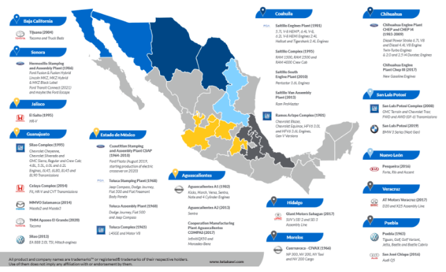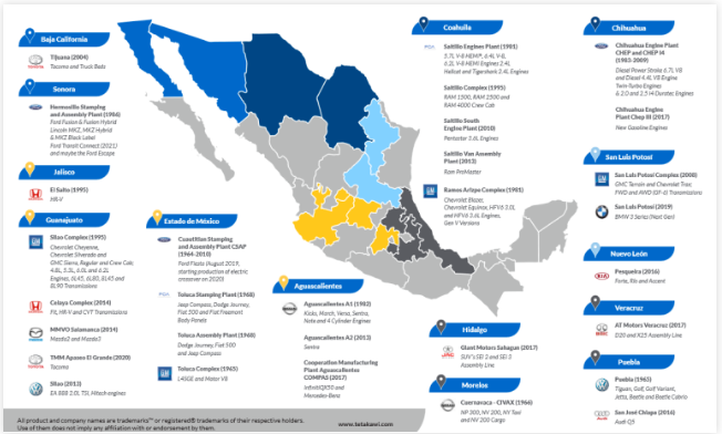 墨西哥汽車制造廠商分布圖,資料來源:tetakawi