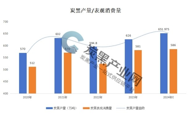 從中橡協(xié)公布的近四年的數(shù)據(jù)顯示,預(yù)計2024年炭黑總產(chǎn)量為651.975萬噸,同比增長4.15%。炭黑表觀消費量為586萬噸,同比增長0.86%。