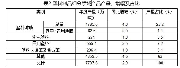 具體到塑料制品的各細分領(lǐng)域,包括塑料板管型材、塑料絲繩及編織品、塑料包裝箱及容器、塑料零件及其他塑料制品類別的產(chǎn)量為4859.5萬噸,占比高達63%。占比第二位是塑料薄膜,產(chǎn)量1785.6萬噸,占比23.2%;其中農(nóng)用薄膜產(chǎn)量為81.6萬噸,同比增長5.5%。此外,泡沫塑料產(chǎn)量同比增長1.0%,日用塑料產(chǎn)量同比增長3.5%,塑料人造革及合成革產(chǎn)量同比增長1.0%。詳見表2。