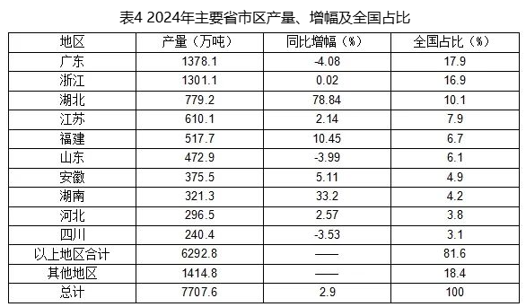 從區(qū)域情況來看,2024年,東部十省區(qū)(統(tǒng)計數(shù)據(jù)未含港澳臺地區(qū)產(chǎn)量)塑料制品產(chǎn)量4895.2萬噸,同比增長3.3%,全國占比63.5%,較2023年全國占比增長0.2個百分點;中部六省塑料制品產(chǎn)量1785.8萬噸,同比增長19.9%,全國占比23.2%,全國占比較2023年增長3.3個百分點;西部十二省區(qū)塑料制品產(chǎn)量885.6萬噸,同比下降20.2%,全國占比11.5%,較2023年全國占比下降3.2個百分點;東北三省塑料制品產(chǎn)量140.9萬噸,同比下降7.3%,全國占比1.8%,較2023年全國占比下降0.2個百分點。詳見表3。