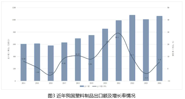 2024年,我國貨物貿(mào)易進出口總值43.85萬億元,同比增長5%,外貿(mào)規(guī)模再創(chuàng)歷史新高。我國塑料制品行業(yè)與我國外貿(mào)大趨勢同步,持續(xù)釋放澎湃動能。據(jù)海關(guān)總署數(shù)據(jù),2024年塑料制品出口總額1060.9億美元,同比增長5.4%,貿(mào)易順差882.9億美元,占全國貨物貿(mào)易進出口順差的8.9%。在近年外部環(huán)境動蕩不安、貿(mào)易保護主義蔓延等不利因素交織的背景下,我國塑料制品行業(yè)的外貿(mào)運行展現(xiàn)出較強的韌性。2014-2024年我國塑料制品出口額及增長率情況見圖3。