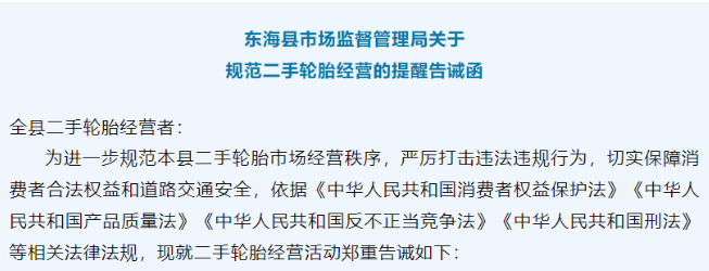 3月14日,江蘇連云港市東海縣市場監(jiān)督管理局發(fā)布了“關于規(guī)范二手輪胎經(jīng)營的提醒告誡函”。