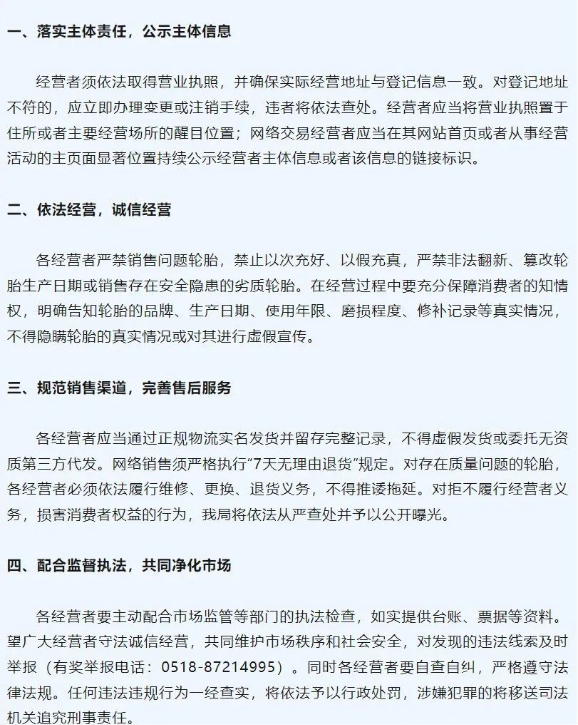 告誡函就二手輪胎經(jīng)營活動鄭重告誡包括:經(jīng)營者須依法取得營業(yè)執(zhí)照,網(wǎng)絡交易經(jīng)營者應當在其網(wǎng)站首頁或者從事經(jīng)營活動的主頁面顯著位置持續(xù)公示經(jīng)營者主體信息或者該信息的鏈接標識;各經(jīng)營者嚴禁銷售問題輪胎,禁止以次充好、以假充真,嚴禁非法翻新、篡改輪胎生產(chǎn)日期或銷售存在安全隱患的劣質(zhì)輪胎;各經(jīng)營者應當通過正規(guī)物流實名發(fā)貨并留存完整記錄,不得虛假發(fā)貨或委托無資質(zhì)第三方代發(fā)。網(wǎng)絡銷售須嚴格執(zhí)行“7天無理由退貨”規(guī)定等。