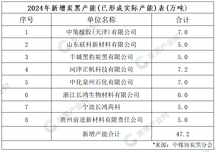 2024年炭黑產(chǎn)能為913萬噸,同比增長了3%,共計形成新增有效產(chǎn)能47.2萬噸。