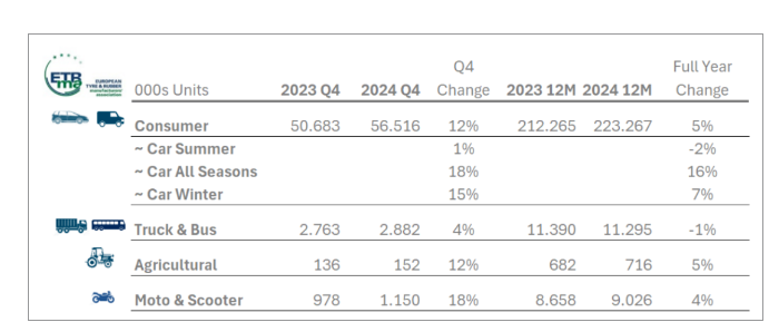 數(shù)據(jù)顯示,2024年乘用車輪胎的銷量有所提升,這主要得益于全季節(jié)輪胎的強(qiáng)勁需求。然而,盡管乘用車輪胎市場(chǎng)有所改善,但與疫情前的水平相比,銷量仍然較低。與此同時(shí),卡車輪胎市場(chǎng)則繼續(xù)承壓,銷量同比2019年下降了10.3%,顯示出市場(chǎng)復(fù)蘇的艱難。