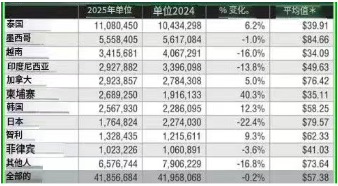 據(jù)炭黑產(chǎn)業(yè)網(wǎng)了解,在乘用車輪胎領(lǐng)域,進口情況并不樂觀,超半數(shù)供應(yīng)國出現(xiàn)下滑。第一季度,美國乘用車輪胎進口量同比下降0.2%,至4190萬條。盡管泰國作為該細分市場的領(lǐng)先者,進口量同比增長了6.2%,達到1110萬條,但其他主要供應(yīng)國如越南、印度尼西亞和日本等則出現(xiàn)了兩位數(shù)的下降。不過,柬埔寨作為增速最快的國家,一季度進口量達到292萬條,同比增長40.3%,成為市場中的一抹亮色。