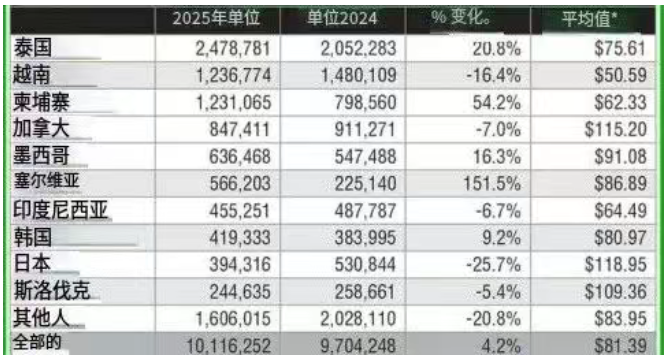 在輕卡輪胎市場,美國一季度進口量實現(xiàn)了4.2%的增長,達到1010萬條。這一增長主要得益于柬埔寨和塞爾維亞輪胎制造商的強勁表現(xiàn)。特別是柬埔寨,作為該類別的第三大供應(yīng)商,進口量同比增長了54.2%。此外,泰國和墨西哥的進口量也有所增長,而越南和加拿大的進口量則出現(xiàn)了下滑。值得注意的是,塞爾維亞的輕卡輪胎進口量在東洋輪胎和玲瓏輪胎經(jīng)營的工廠推動下,實現(xiàn)了151.5%的暴增。