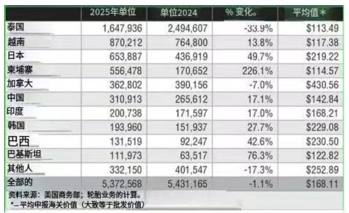 【炭黑產(chǎn)業(yè)網(wǎng)】5月25日消息,近日,美國商務(wù)部公布了今年第一季度美國輪胎進口的詳細數(shù)據(jù)。在全球貿(mào)易形勢復(fù)雜多變,特別是汽車零部件關(guān)稅政策調(diào)整的背景下,美國輪胎進口市場展現(xiàn)出新的動態(tài),各類輪胎進口情況呈現(xiàn)出不同的增長或下滑態(tài)勢。